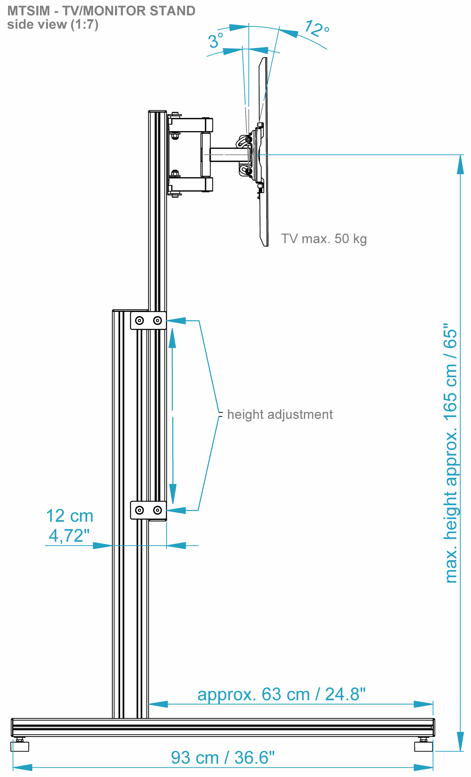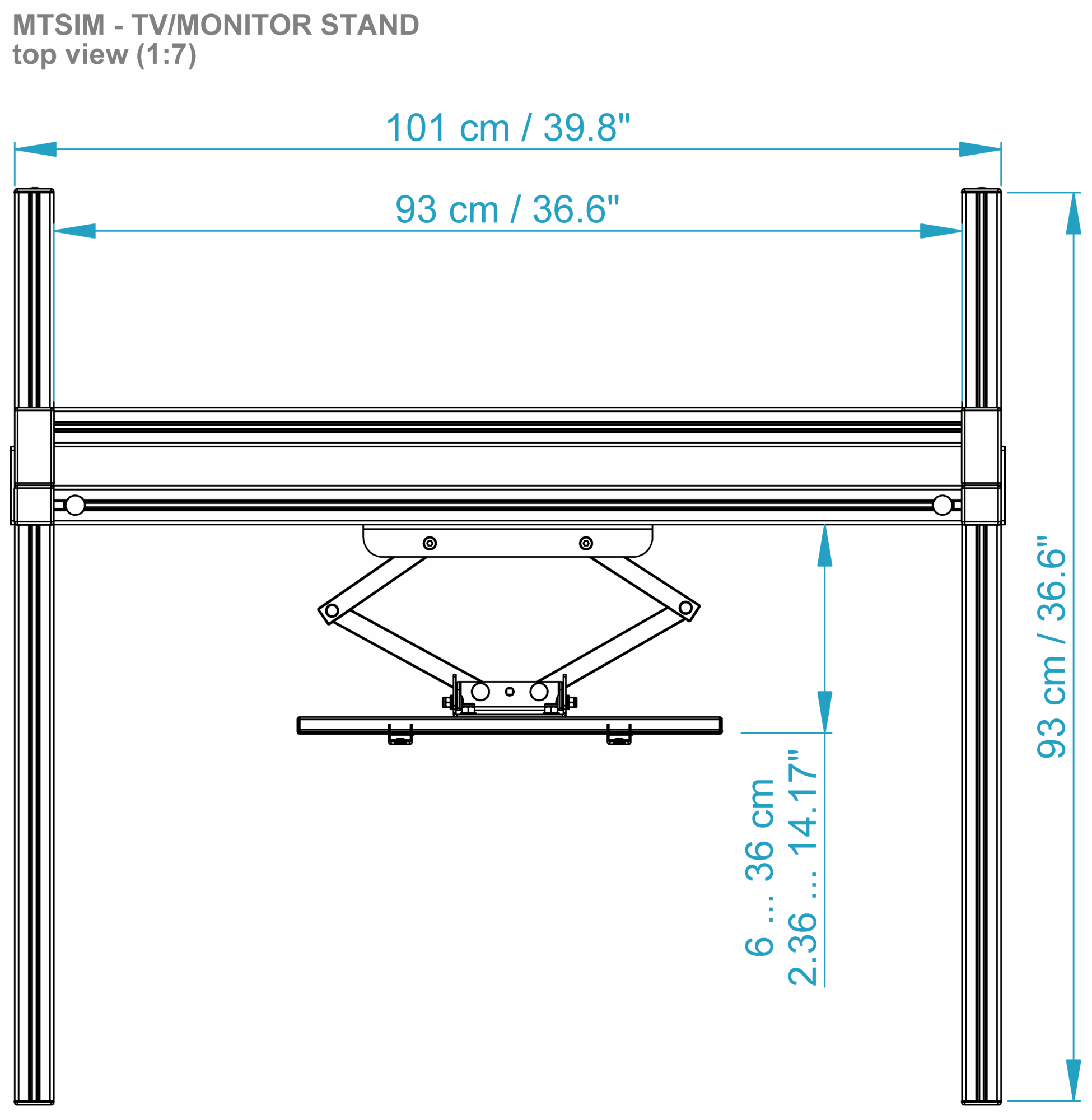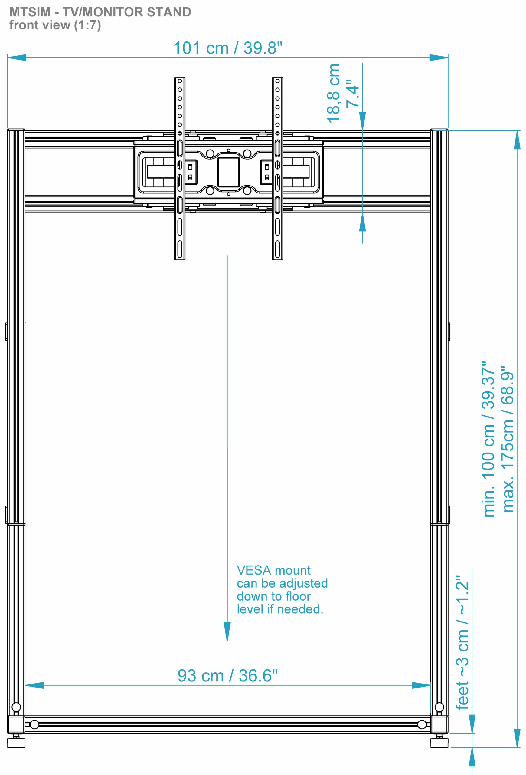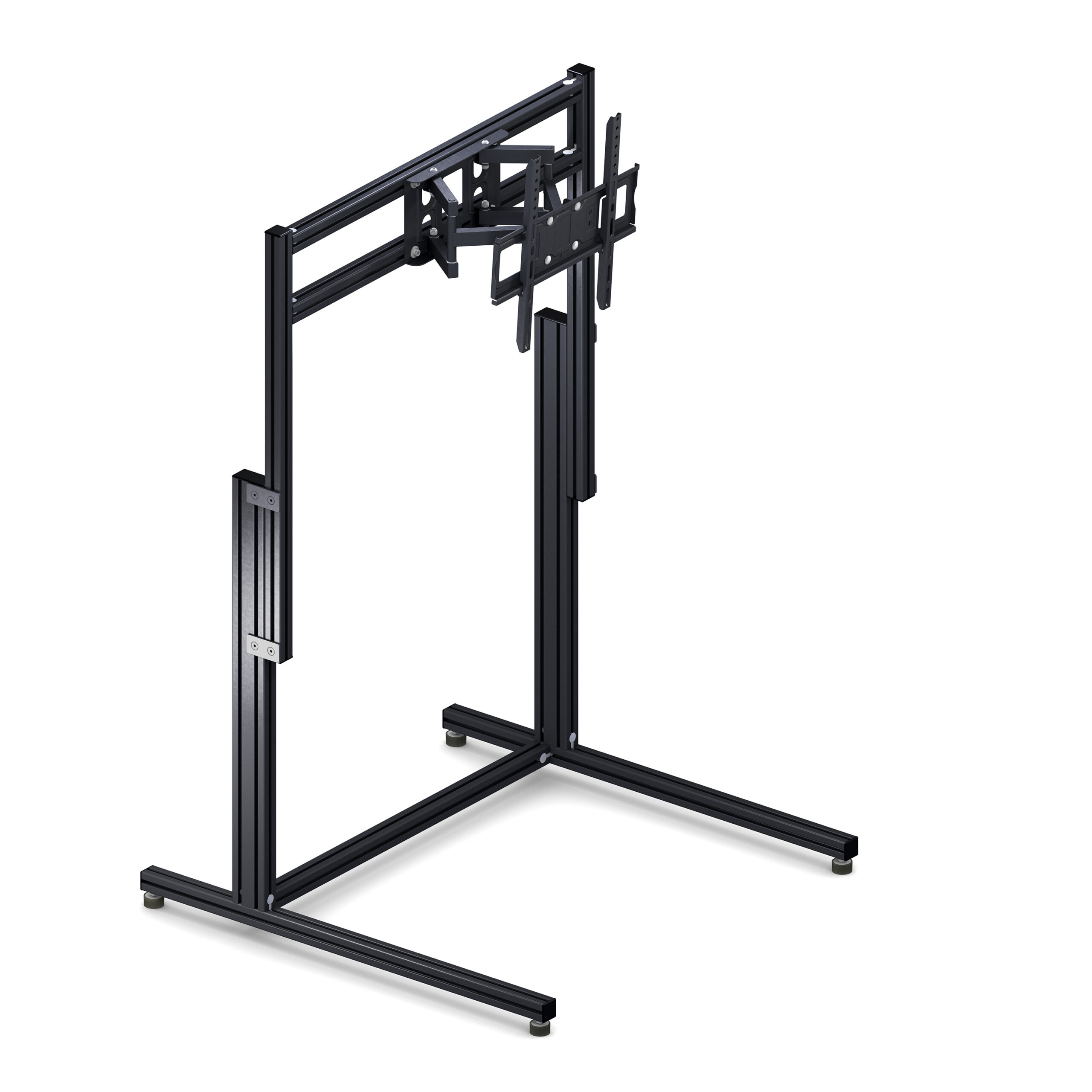 Die TV/Monitor Halterung ist selbststehend und ist für einen Fernseher oder Monitor ausgelegt. Die Aluminiumprofile sind sehr stabil und können selbst große und schwere Fernseher tragen.